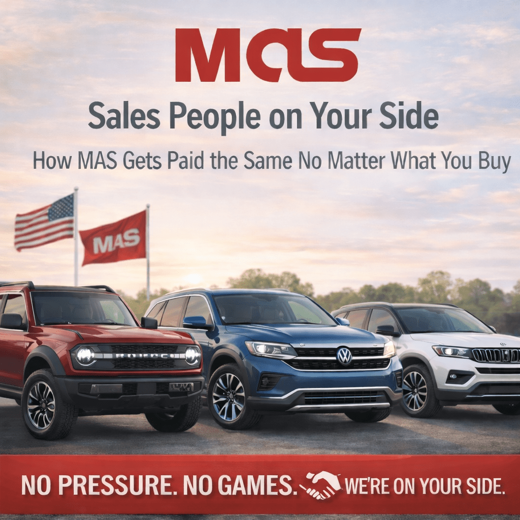 MAS flips that model completely. Every rep earns the same flat commission whether you buy a $25,000 sedan or a $70,000 SUV. There’s zero financial incentive to push you toward something more expensive. In fact, the only incentive that matters is making sure you’re happy โ because satisfied customers come back and refer their friends.